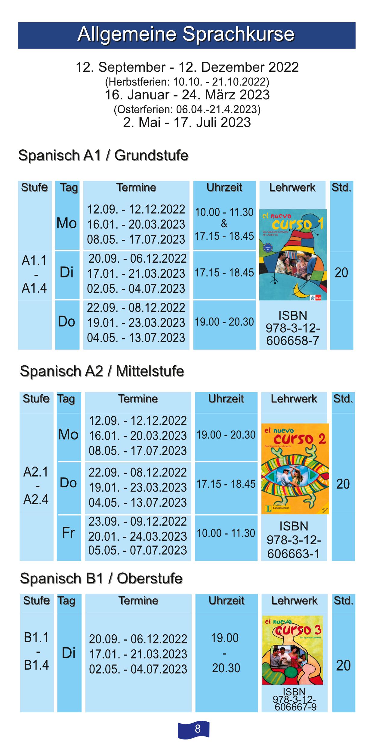 Start ab dem 15.01.2026z.B. Anfängerkurse (A1.1): Mo., 10.00–11.30 Uhr, Mo. od. Di., 17.15–18.45 oder Do. 19.00–20.30 Uhr